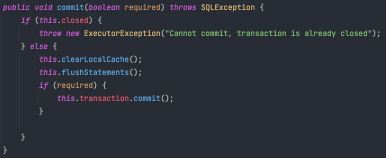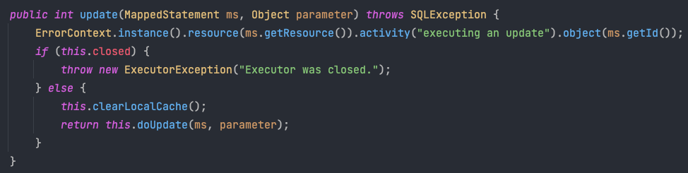 query() 메소드 외에도 같은 클래스 내부에 있는 commit(), rollback(), update() 메소드에서도 로컬 캐시를 지워주고 있습니다.