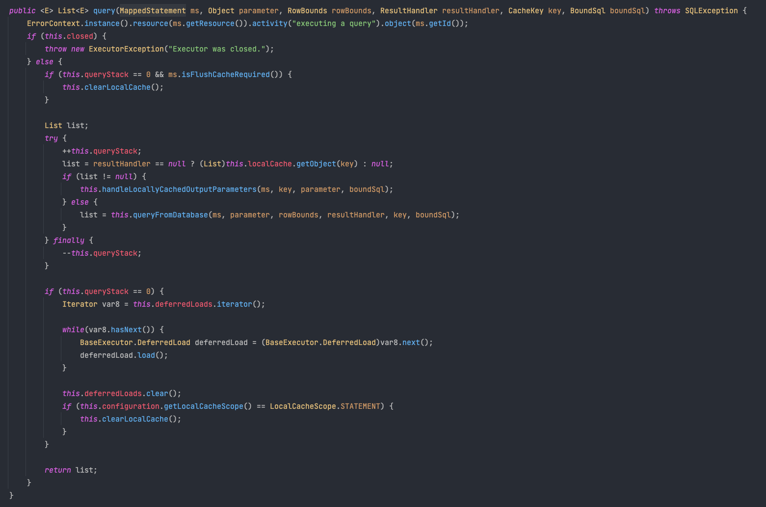 SqlSessionTemplate을 통해 쿼리를 실행할 경우, BaseExecutor:query()를 사용하게 됩니다.
